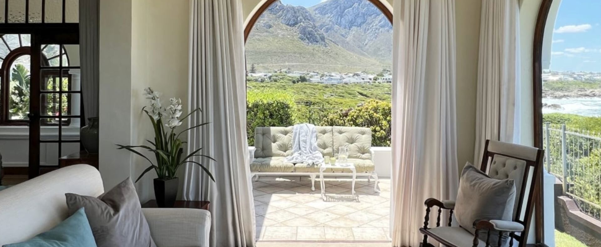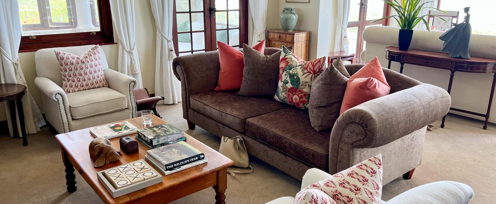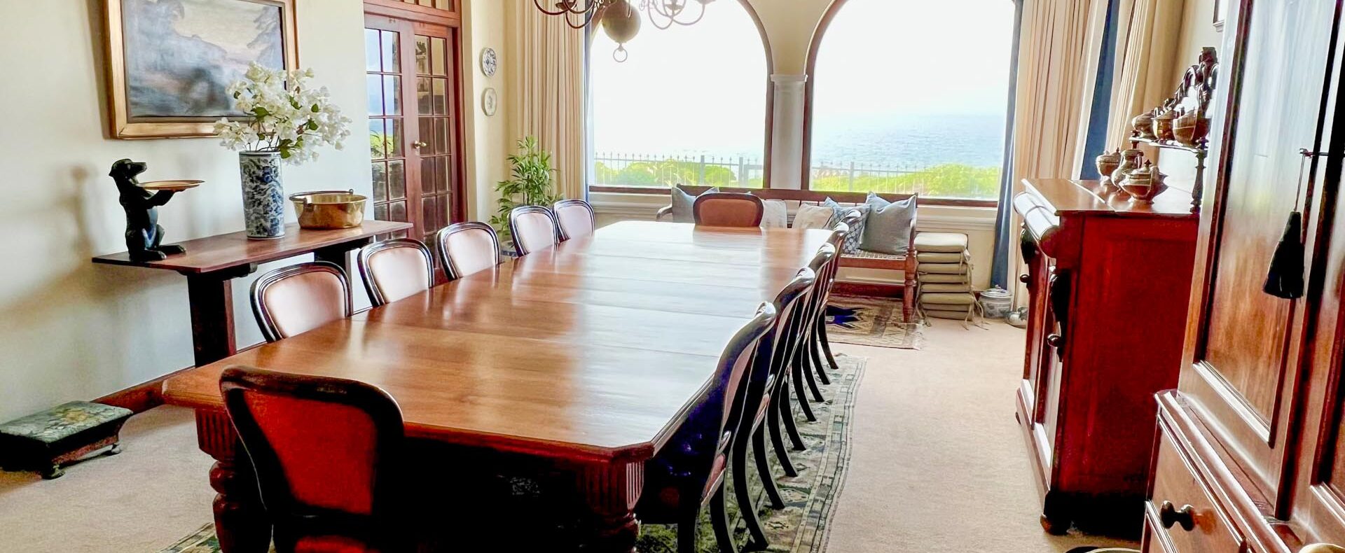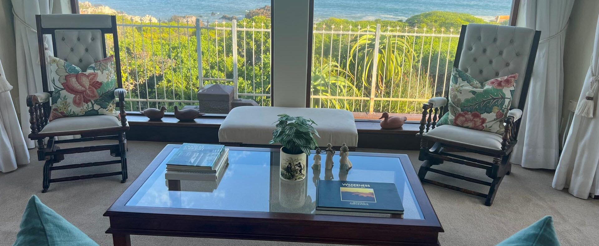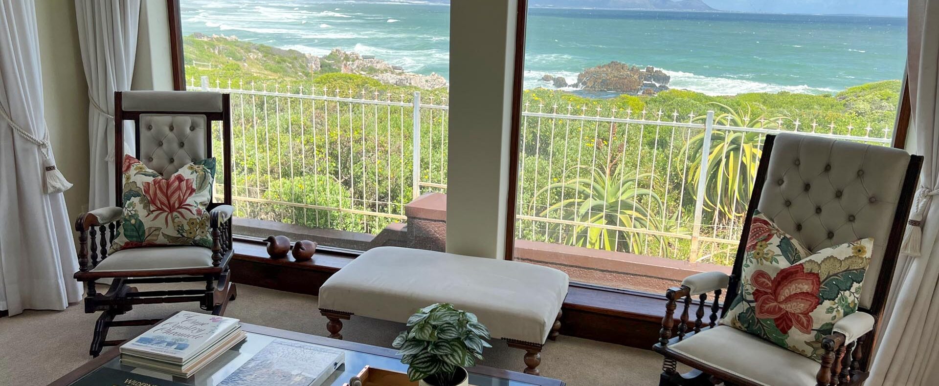 The house is furnished with an eclectic mix of English antiques and Africana. This is a well-loved family home with desired pieces handed down from family or collected personally over the years. The atmosphere is relaxing, and the house has the charm of yesteryear when the pace of life was much slower. It is a place where you can sit back and enjoy the surrounding beauty of mountain, sea and fynbos and learn to breathe again.